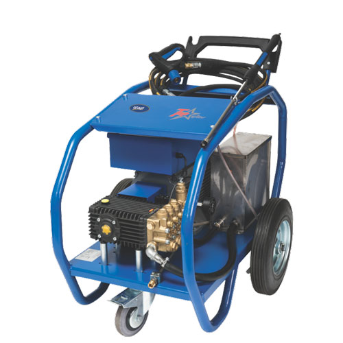 The high pressure pump is directly coupled to a standard speed electric motor. Operation of the machine is controlled from the “trigger” type safety spray lance.