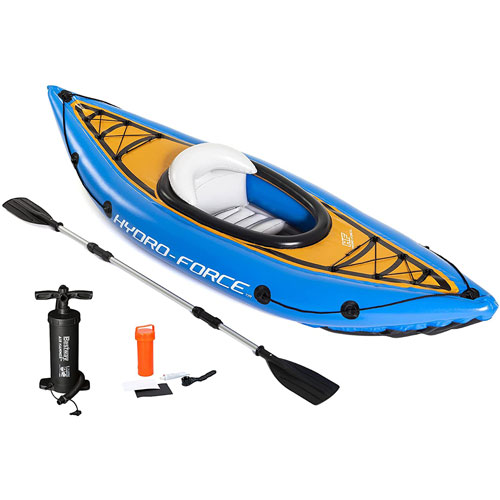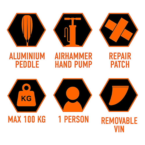 Including: Paddle, removable fin, repair kit, hand pump and removable seat