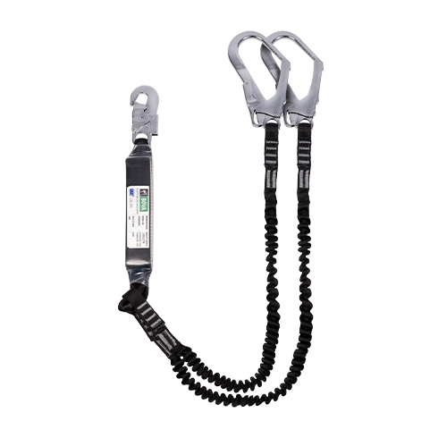 This is an elasticated double leg, shock absorbing lanyard with two Scaffolding hooks and a single Snap hook connector that is engineered to attach to a dorsal D-Ring on a stand-alone, fall arrest harness.