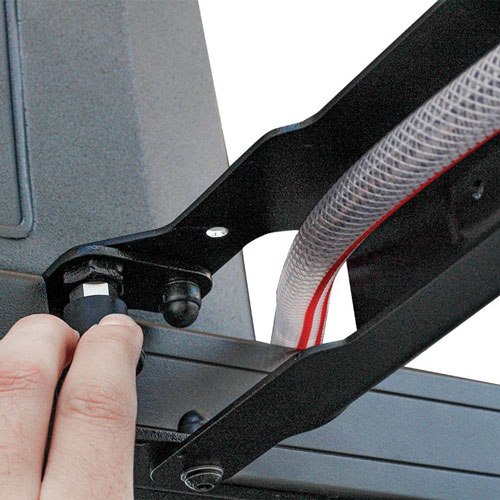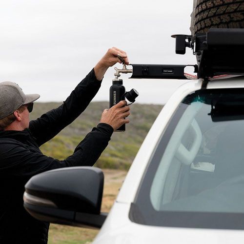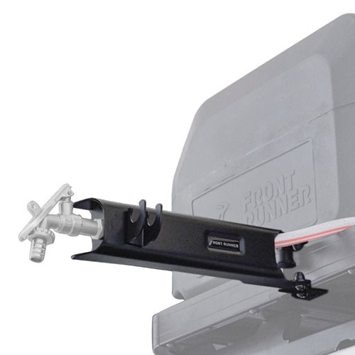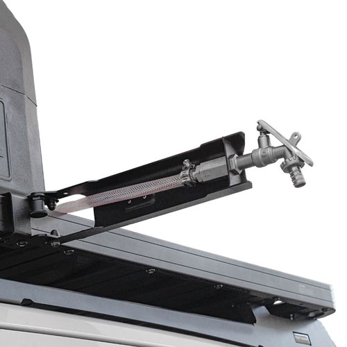 Swings out 90 degrees from the side of the rack, allowing your water tap to clear the side of your vehicle.