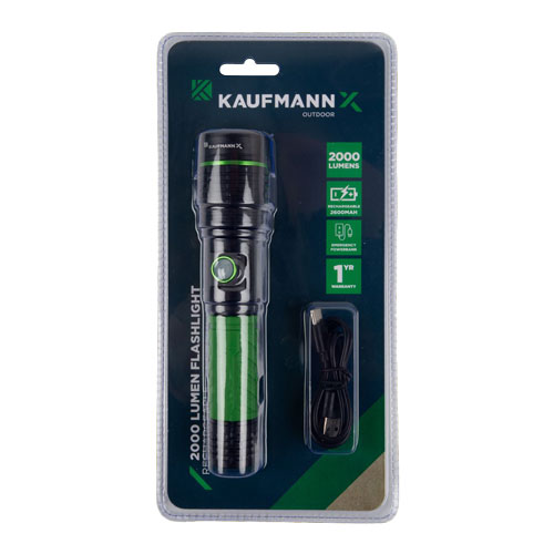 The Kaufmann Flashlight X 2000 Lumen combines powerful illumination with the convenience of USB recharging, ensuring dependable light whenever and wherever you need it.