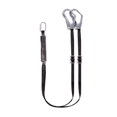 This is an adjustable double leg, shock absorbing lanyard with two Scaffolding hooks and a single screw gate carabineer that is engineered to attach to a dorsal D-Ring on a stand-alone, fall arrest harness.